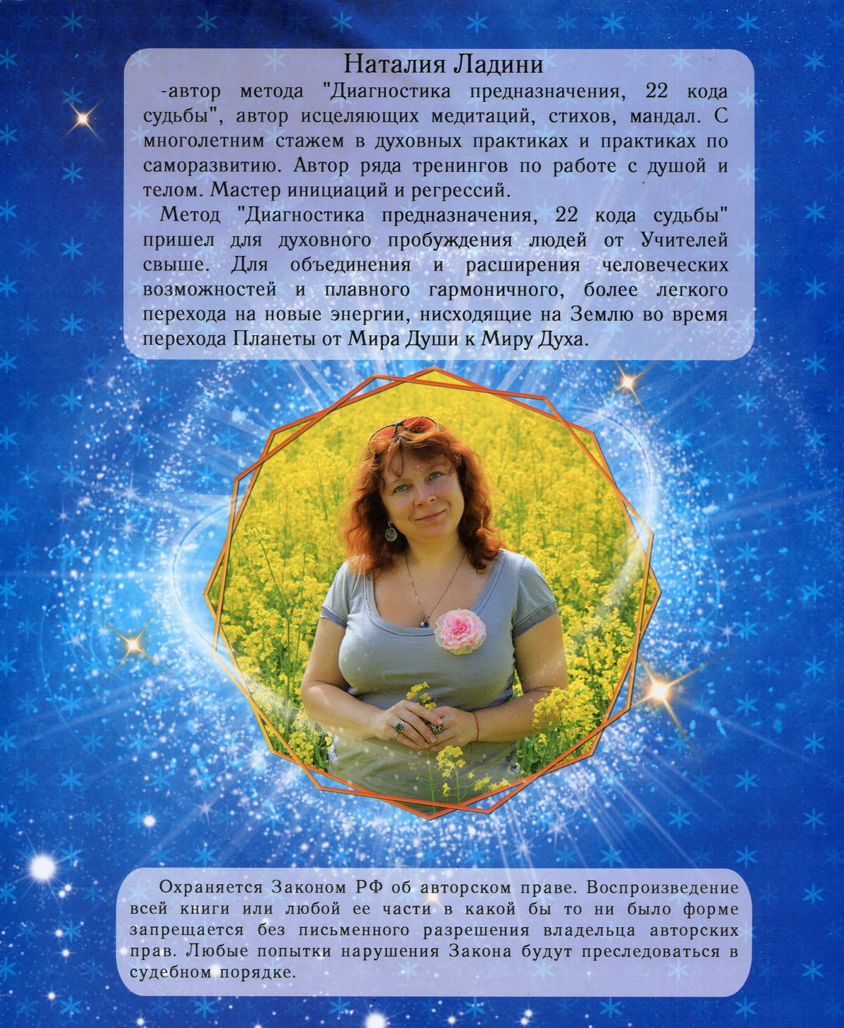 Радий Вам повідомити, що вийшла друком оновлена книга Наталії Ладіні "Диагностика предназначения и коррекция судьбы", в якій доповнено і розширено інформацію, яка стосується методу діагностики призначення, зокрема: описи всіх 22-х матричних кодів долі, опис складання карти (матриці, мандали) по даті народження людини, опис та історія створення зцілюючих медитацій для кожного коду долі та для зцілення карми, трансформацій складних ситуацій в житті та хвороб фізичного тіла.